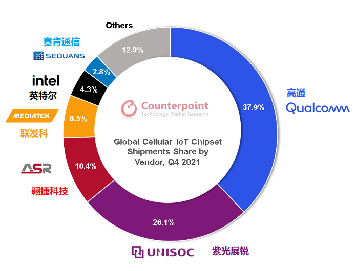 幾乎所有物聯(lián)網(wǎng)終端都需搭載IoT通信芯片,因而通信射頻芯片能夠直觀反映物聯(lián)網(wǎng)行業(yè)的成長(zhǎng)周期與終端需求,堪稱(chēng)行業(yè)風(fēng)向標(biāo)。在Counterpoint發(fā)布的全球蜂窩物聯(lián)網(wǎng)芯片追蹤報(bào)告中,高通、紫光展銳、翱捷科技、聯(lián)發(fā)科、英特爾、Sequans、華為海思等占據(jù)了大部分市場(chǎng)份額。