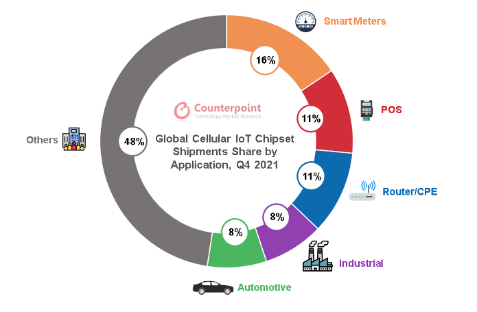 在蜂窩物聯(lián)網(wǎng)芯片中,當(dāng)前應(yīng)用規(guī)模最大的是低速率的NB-IoT芯片(占比60%),NB-IoT也是我國(guó)主推的物聯(lián)網(wǎng)連接方式,應(yīng)用在智能儀器表盤(pán)、資產(chǎn)追蹤等場(chǎng)景。其次是中速率的2G/3G(占比30%),用于移動(dòng)支付、智能穿戴和智能家居中。4G Cat.1和5G大約占比10%, 5G模組的成本過(guò)高,加上大部分物聯(lián)網(wǎng)終端對(duì)傳輸速率的需求性不高,5G在物聯(lián)網(wǎng)終端的應(yīng)用占比較低,主要是自動(dòng)駕駛和視頻監(jiān)控領(lǐng)域,但隨著2G/3G轉(zhuǎn)網(wǎng),Cat.1在智能支付、定位追蹤、車(chē)載終端、視頻監(jiān)控領(lǐng)域的高速增長(zhǎng),正逐漸打破蜂窩物聯(lián)網(wǎng)6:3:1的格局。從應(yīng)用場(chǎng)景來(lái)看,智能表計(jì)、POS支付、路由器/CPE、工業(yè)、汽車(chē)是蜂窩物聯(lián)網(wǎng)芯片應(yīng)用最廣泛的前五大場(chǎng)景。