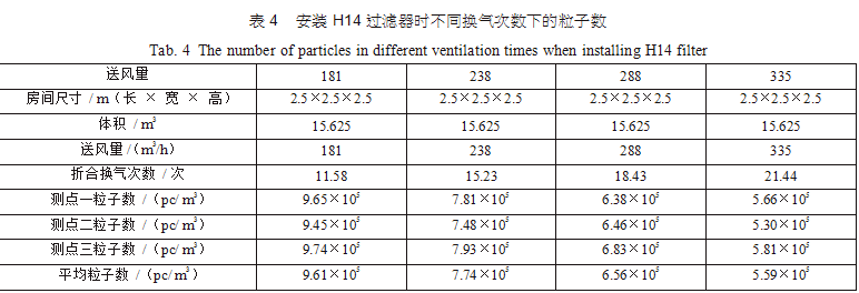 在空調(diào)機(jī)房中新建了三間2.5m×2.5m×2.5m的潔凈間,從空調(diào)主風(fēng)管引風(fēng),每支支管設(shè)置調(diào)節(jié) 閥,并設(shè)排風(fēng)機(jī)進(jìn)行全排,送回風(fēng)口及測(cè)點(diǎn)布置分別如圖 3(每點(diǎn)取樣三次,取平均值)。考慮到初中效過(guò)濾器對(duì)最后潔凈度的影響和最后理論塵埃數(shù)量 計(jì)算的方便,試驗(yàn)用初中效繼續(xù)分別為G4、F8,三個(gè)房間分別安裝高效過(guò)濾器,風(fēng)量500m3/h,第一組數(shù)據(jù)為送風(fēng)量按GMP 驗(yàn)證指南推薦換氣次數(shù)保持不變,分別用H12、H13、H14、U15過(guò)濾器,第二組數(shù)據(jù)為采用H13高效過(guò)濾器,調(diào)節(jié)風(fēng)量 ;第三組數(shù)據(jù)為采用H14高效過(guò)濾器,調(diào)節(jié)風(fēng)量,分別測(cè)得塵埃粒子數(shù),并列表得出不同的換氣次數(shù)下對(duì)應(yīng)的塵埃數(shù)如表2、表3、表4。
